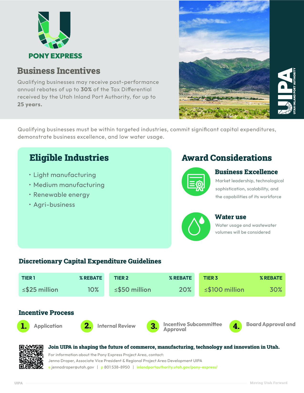 Qualifying businesses may receive post-performance annual rebates of up to 30% of the Tax Differential received by the Utah Inland Port Authority, for up to 25 years.